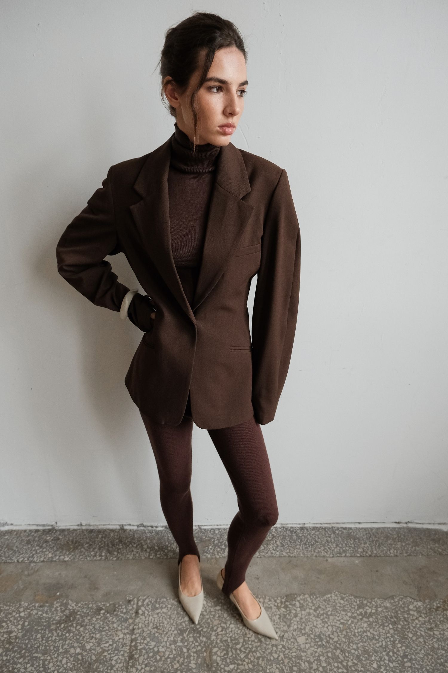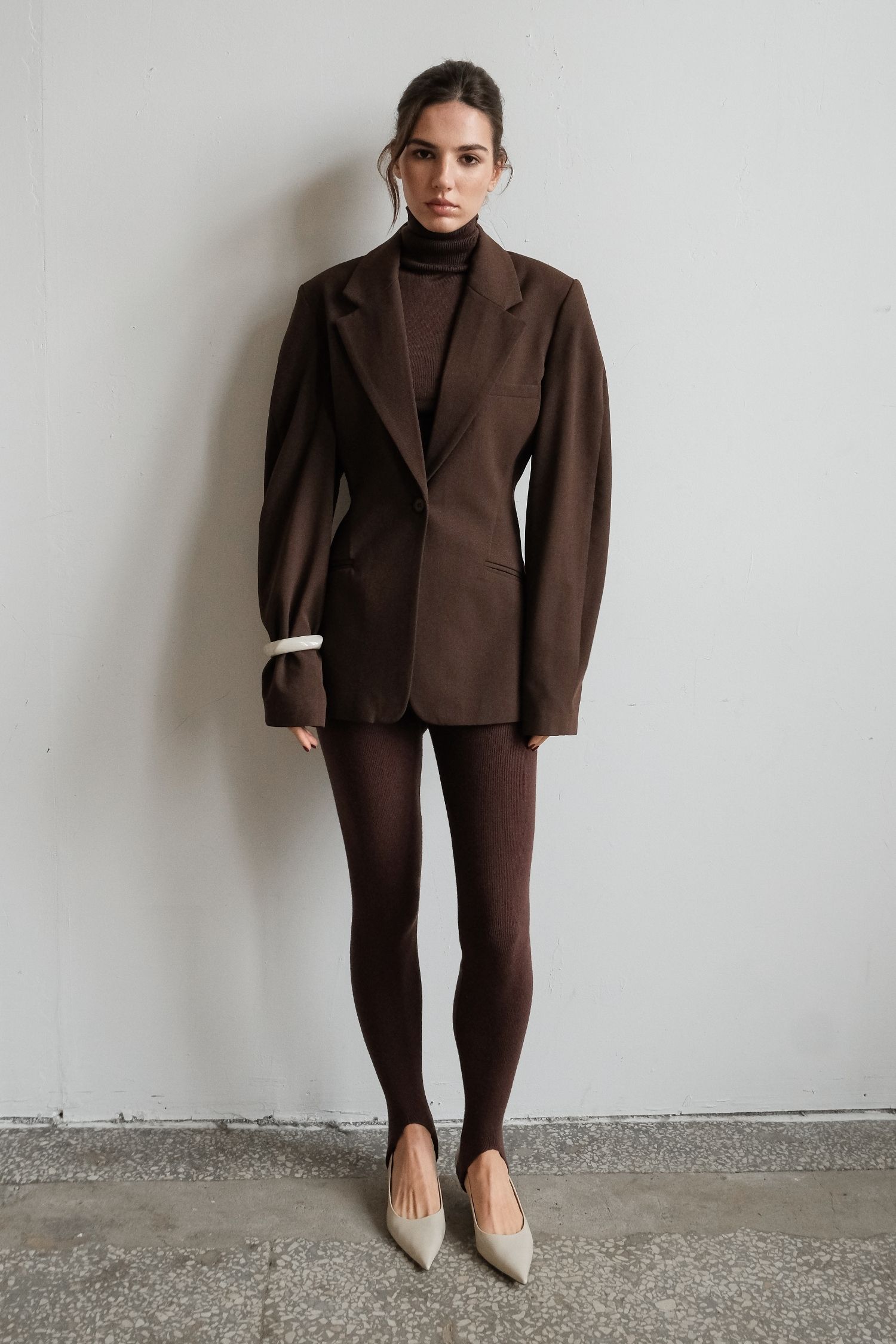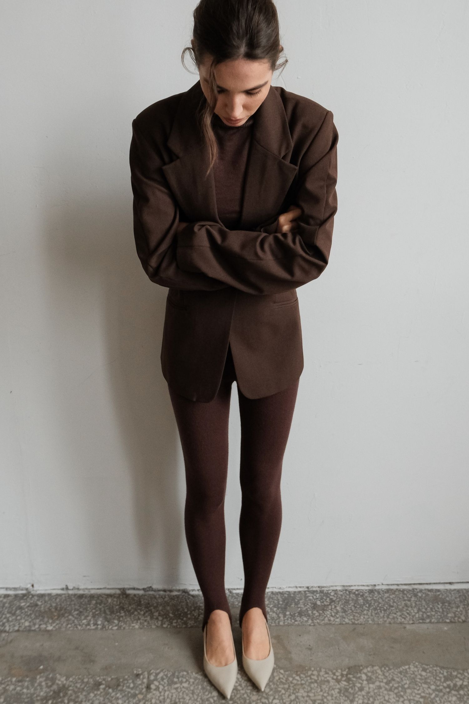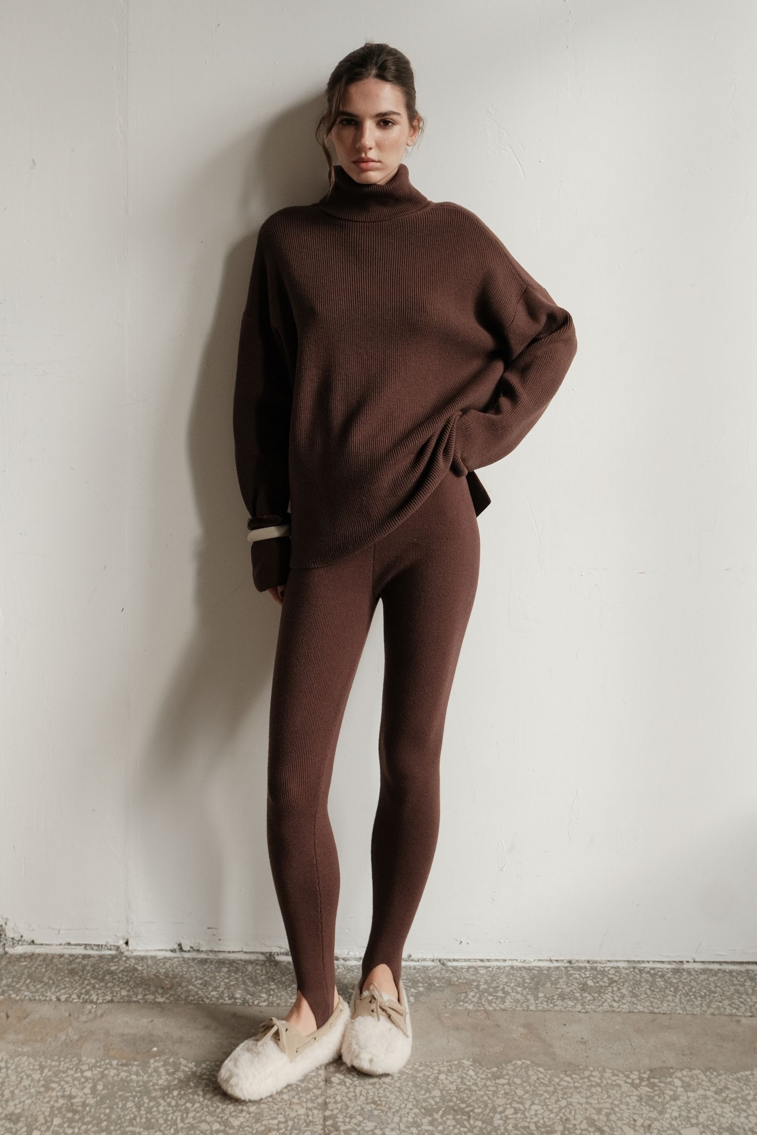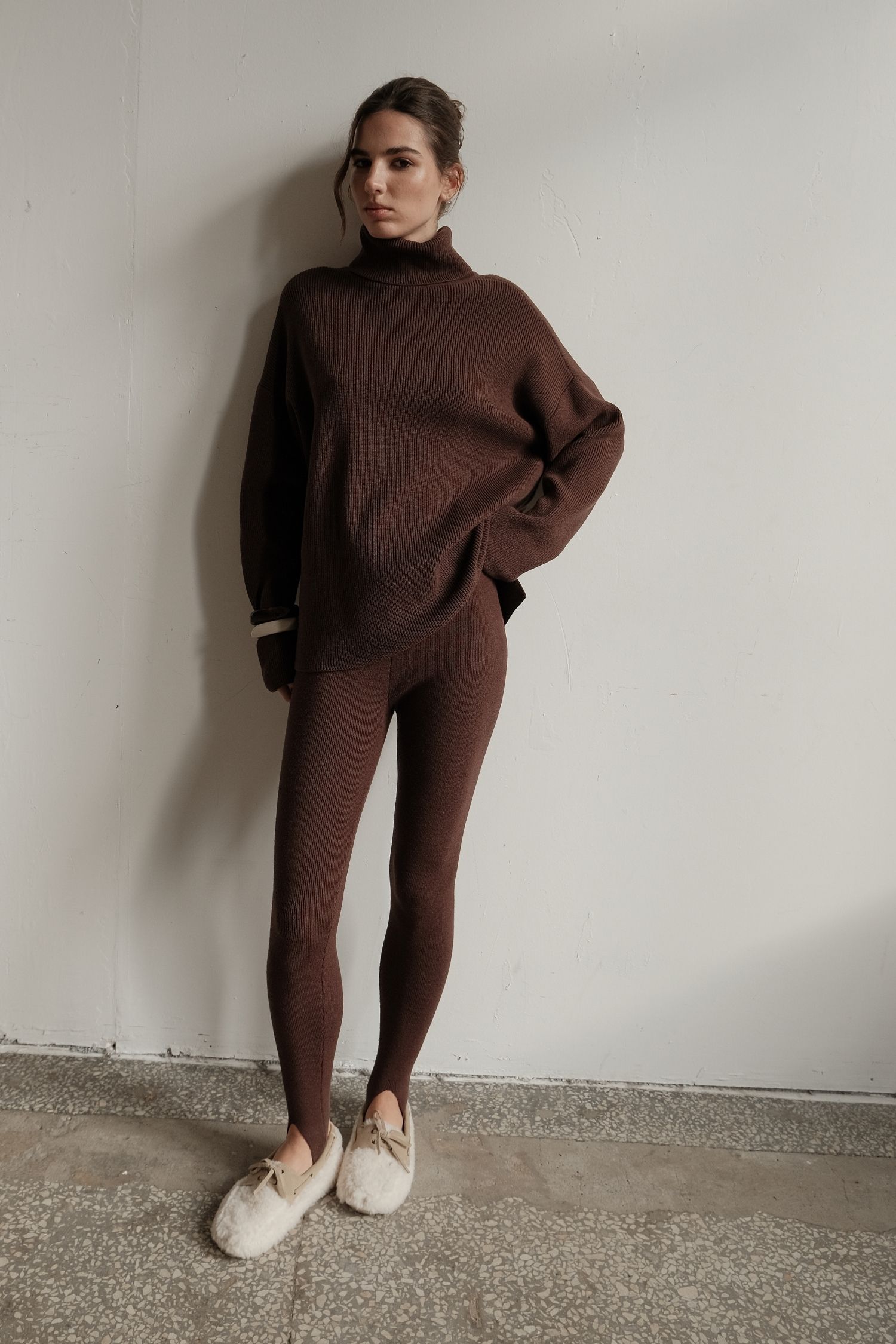 Women’s knitted leggings with straps. Chocolate-colored leggings made of soft and body-pleasing yarn. Warm and extremely comfortable model in a trendy shade that goes perfectly with sweaters, shirts, jumpers and various outerwear.