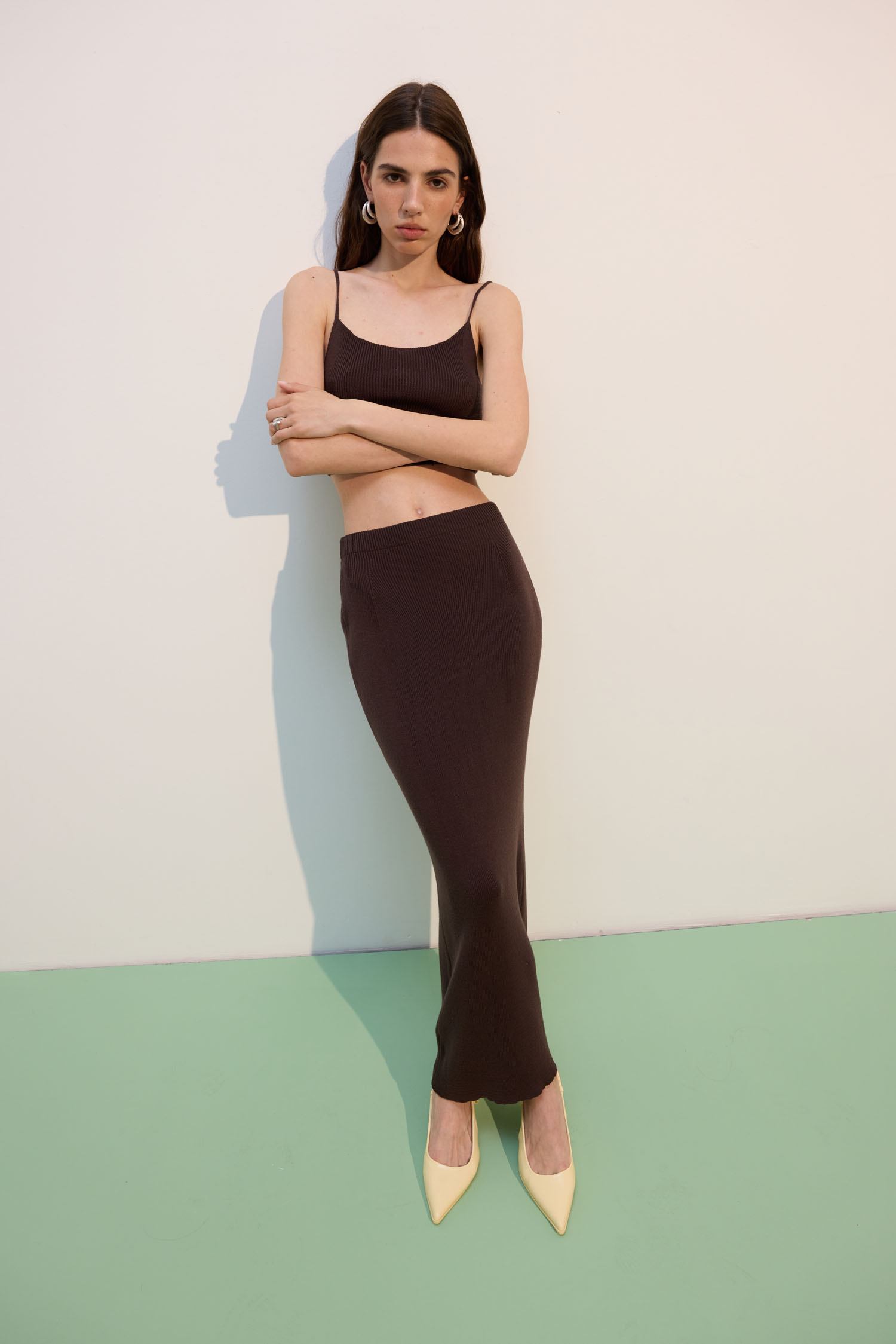 Knitted skirt in a rich chocolate shade. The texture of the skirt is ribbed. The midi-length skirt has a silhouette cut and fits perfectly on the figure. The Lace stylists advise combining the skirt with a knitted top in tone to create a monochrome look.