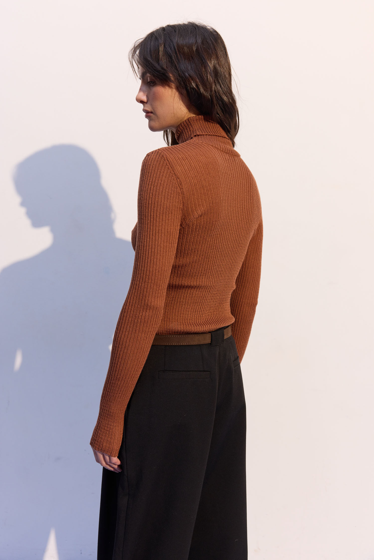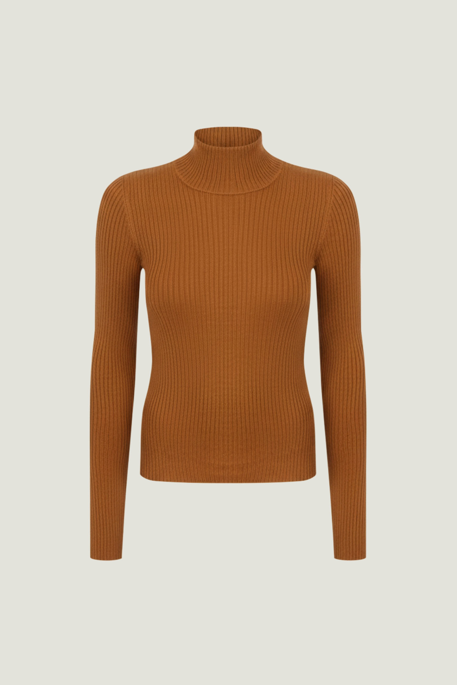 Women's thin ribbed turtleneck sweater in caramel