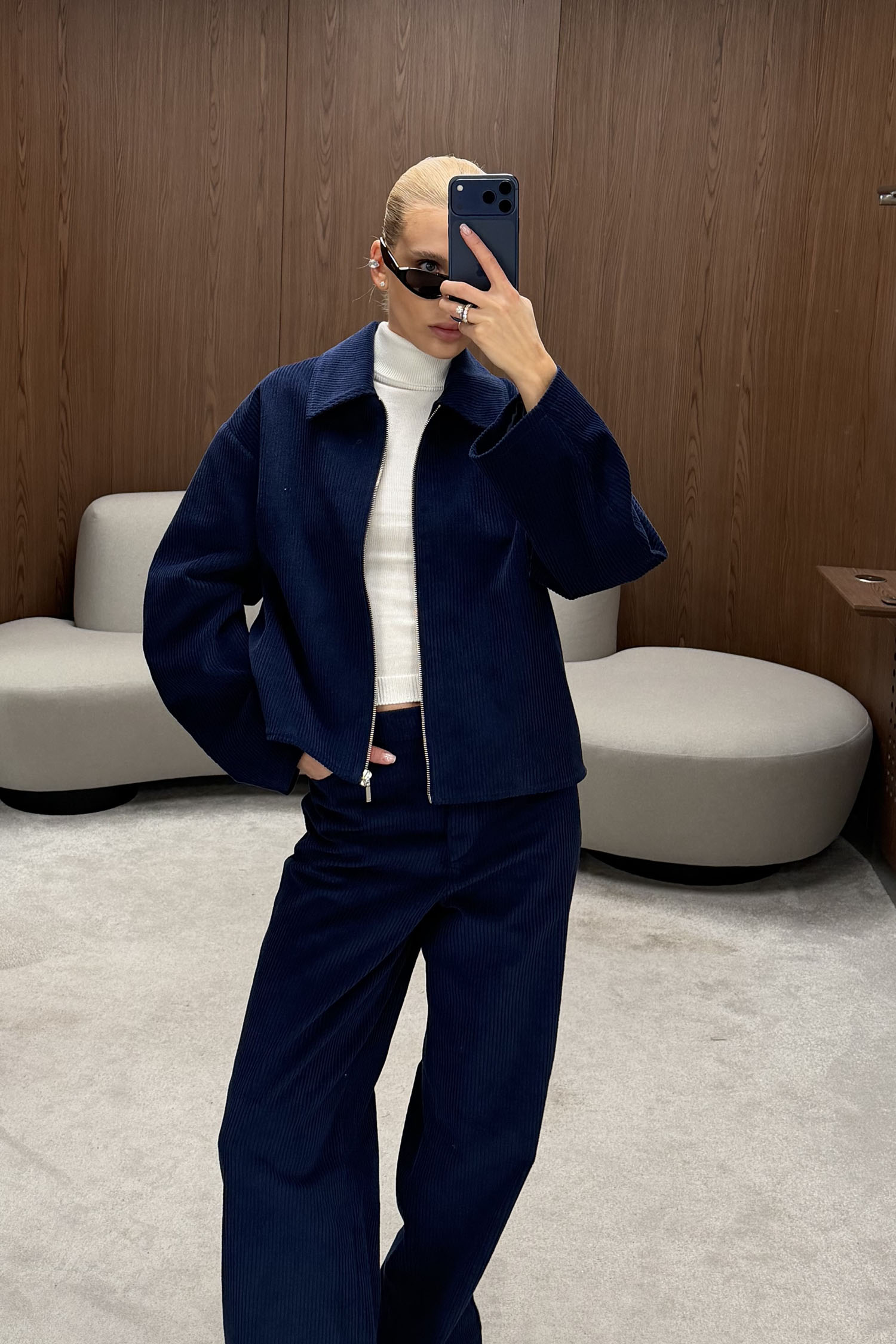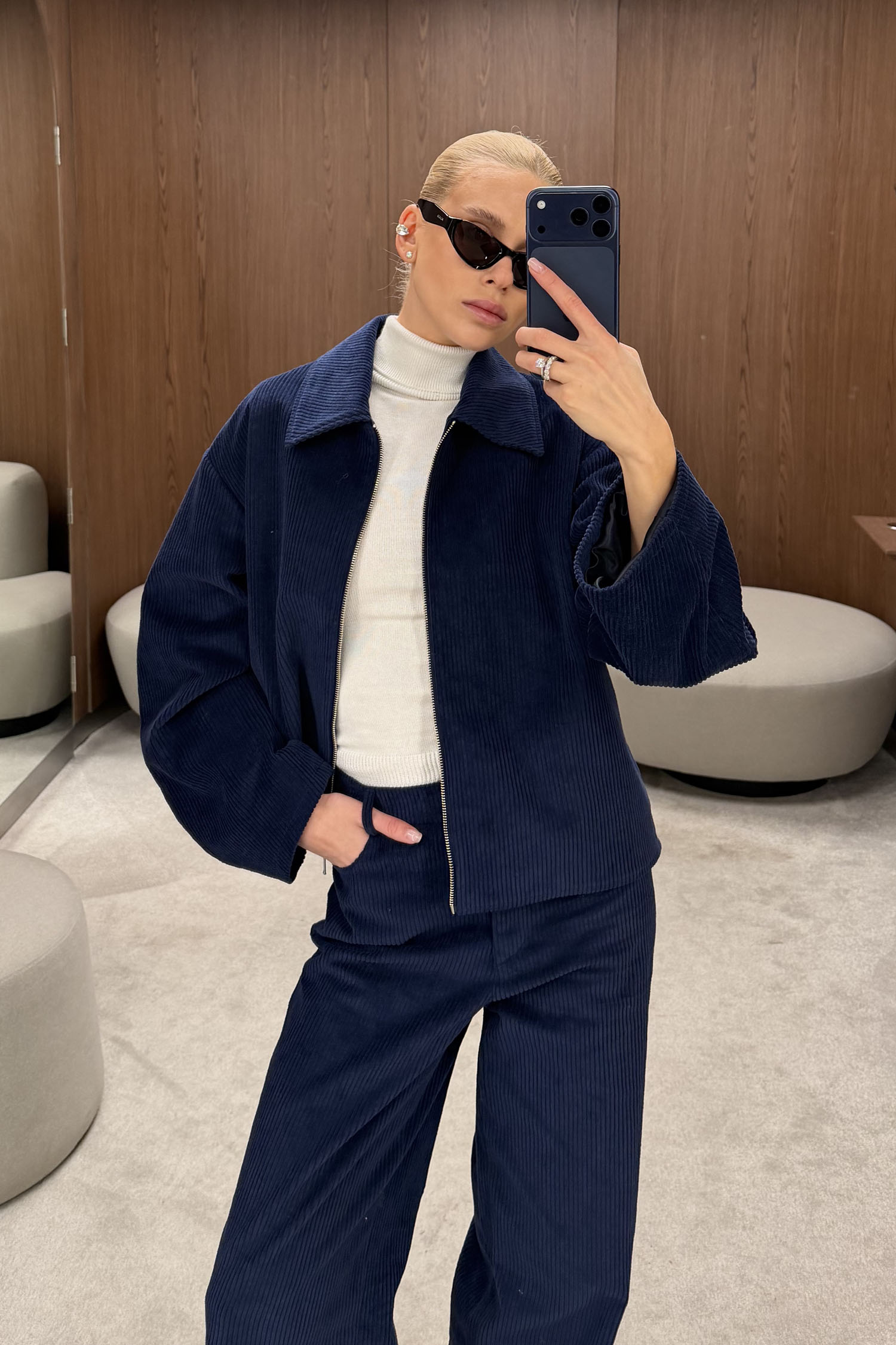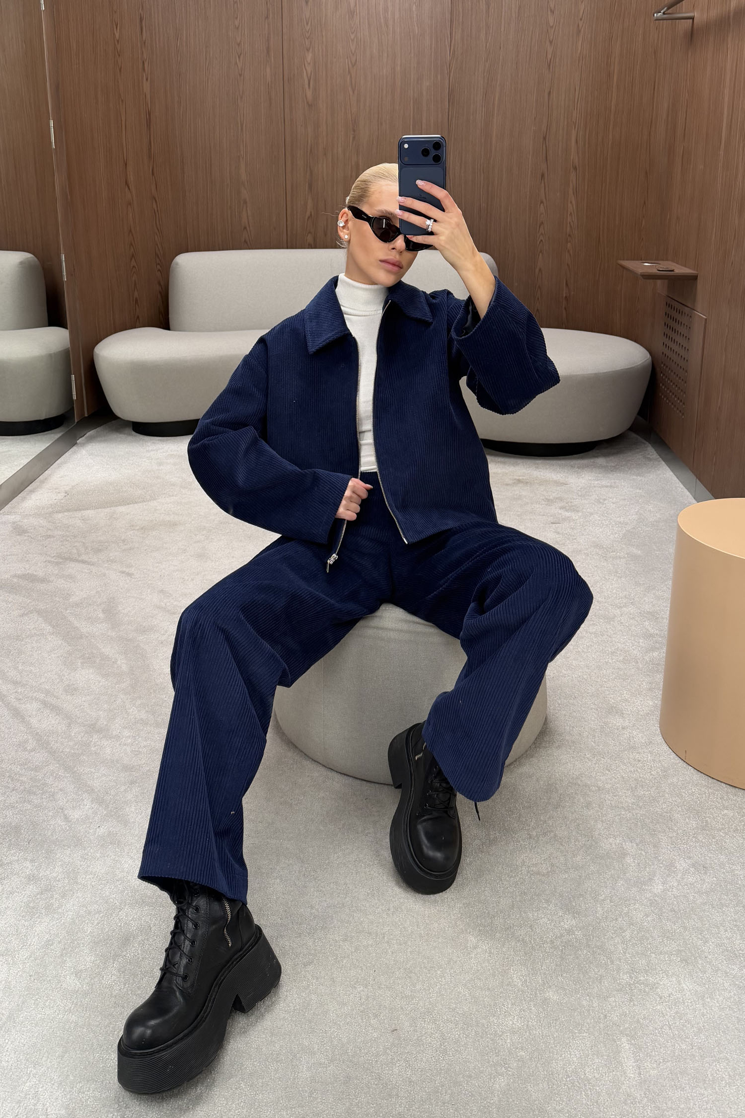 Женский вельветовый бомбер в оттенке Navy blue. Темно-синий бомбер с объемными рукавами. Модель имеет вискозную подкладку и застегивается на молнию. Яркий бомбер, идеально сочетающийся с любыми вещами. Идеальной же комбинацией для него станут брюки в тон, позволяющие создать стильный монохромный аутфит.