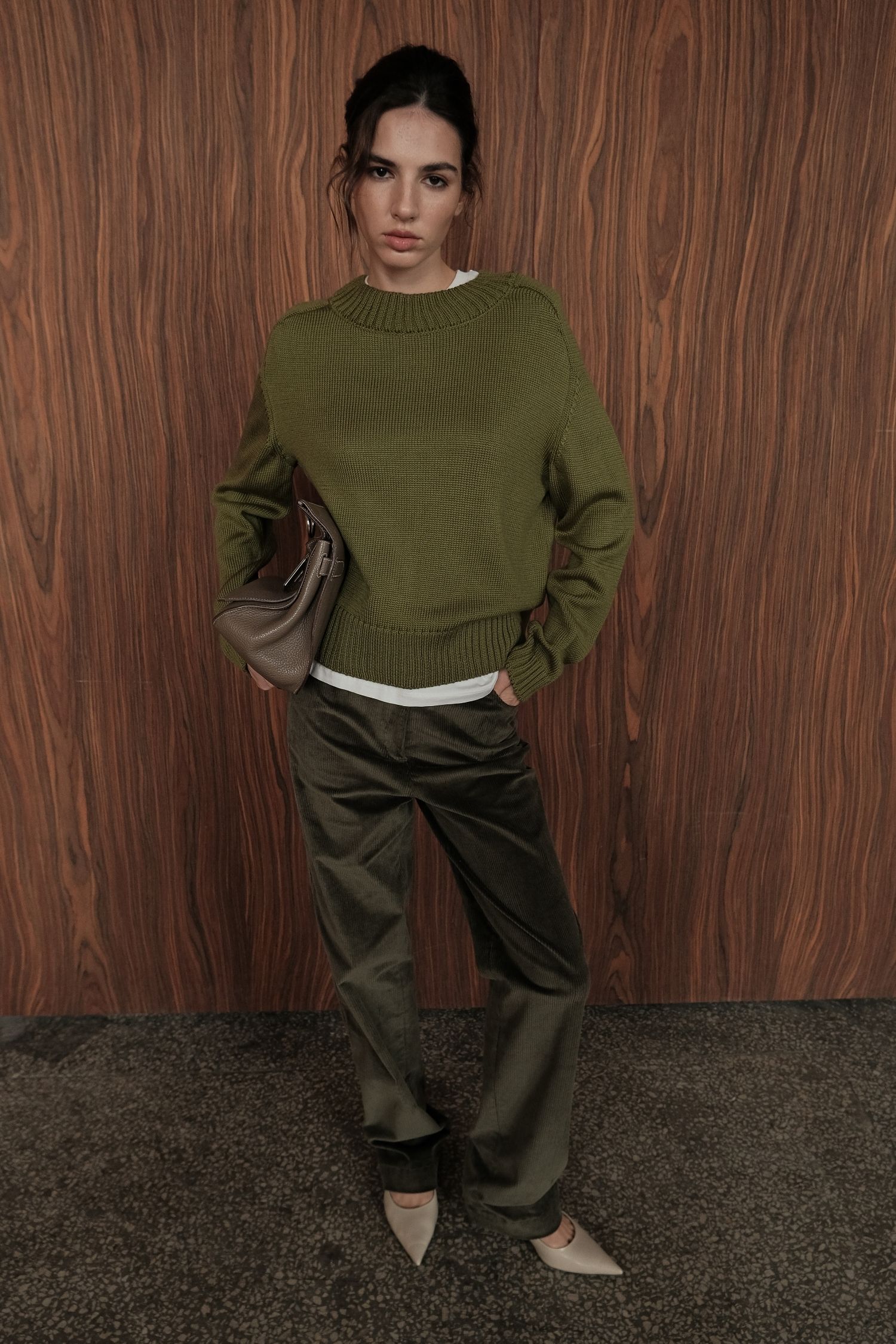 Женские вельветовые брюки оливкового цвета. Брюки прямого кроя на высокой посадке. Лаконичная и стильная модель из текстурного вельвета, который придаст глубины твоим осенним аутфитам.