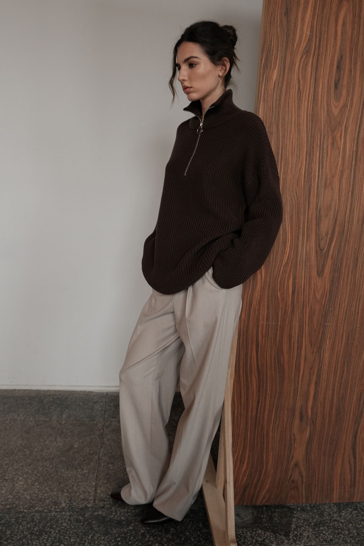 Женские брюки палаццо светло-бежевого цвета. Классические палаццо на высокой посадке с защипами и функциональными боковыми карманами. Выполнены из плотной костюмной ткани с добавлением шерсти. Такие брюки – идеальная основа для множества стильных осенне-зимних образов.