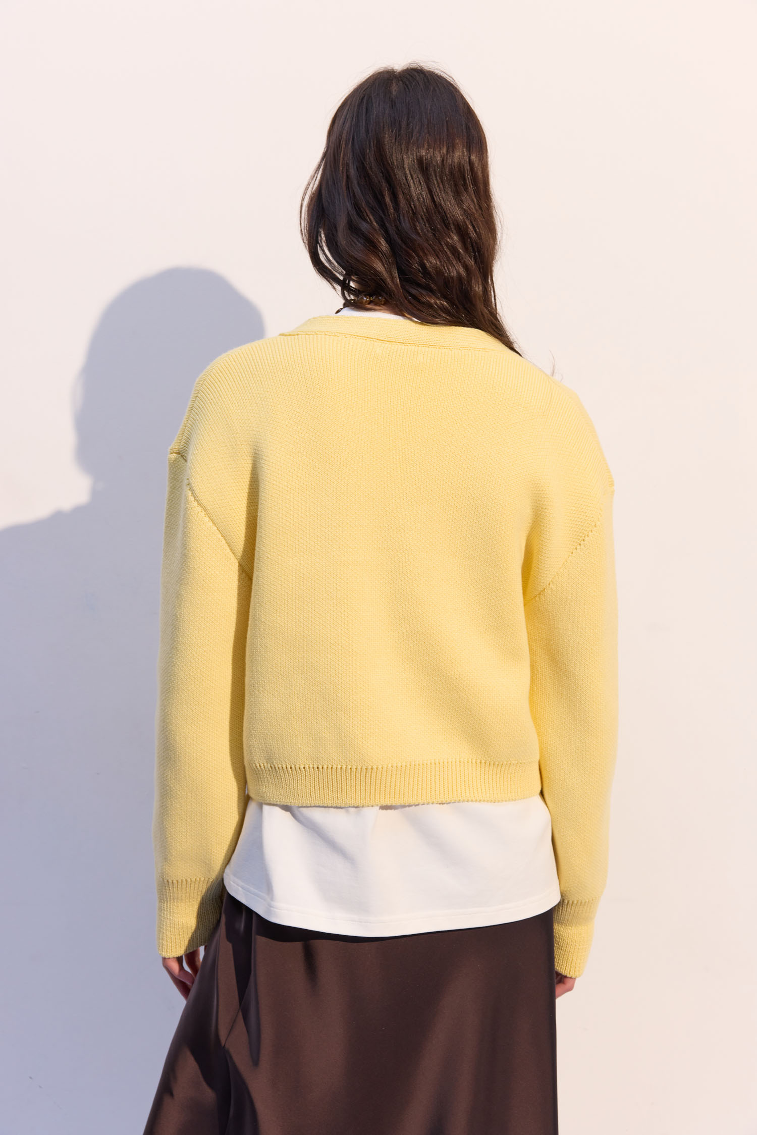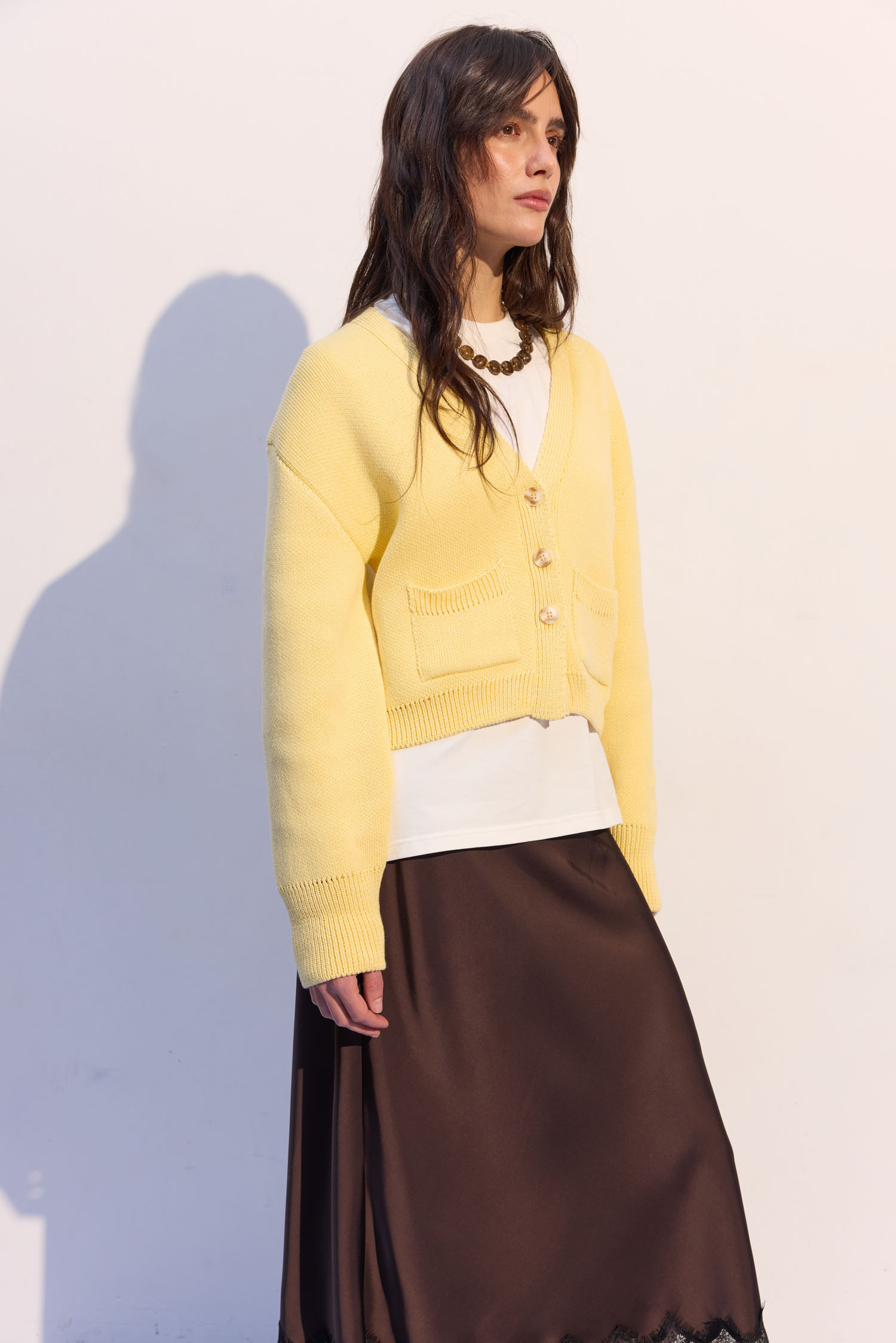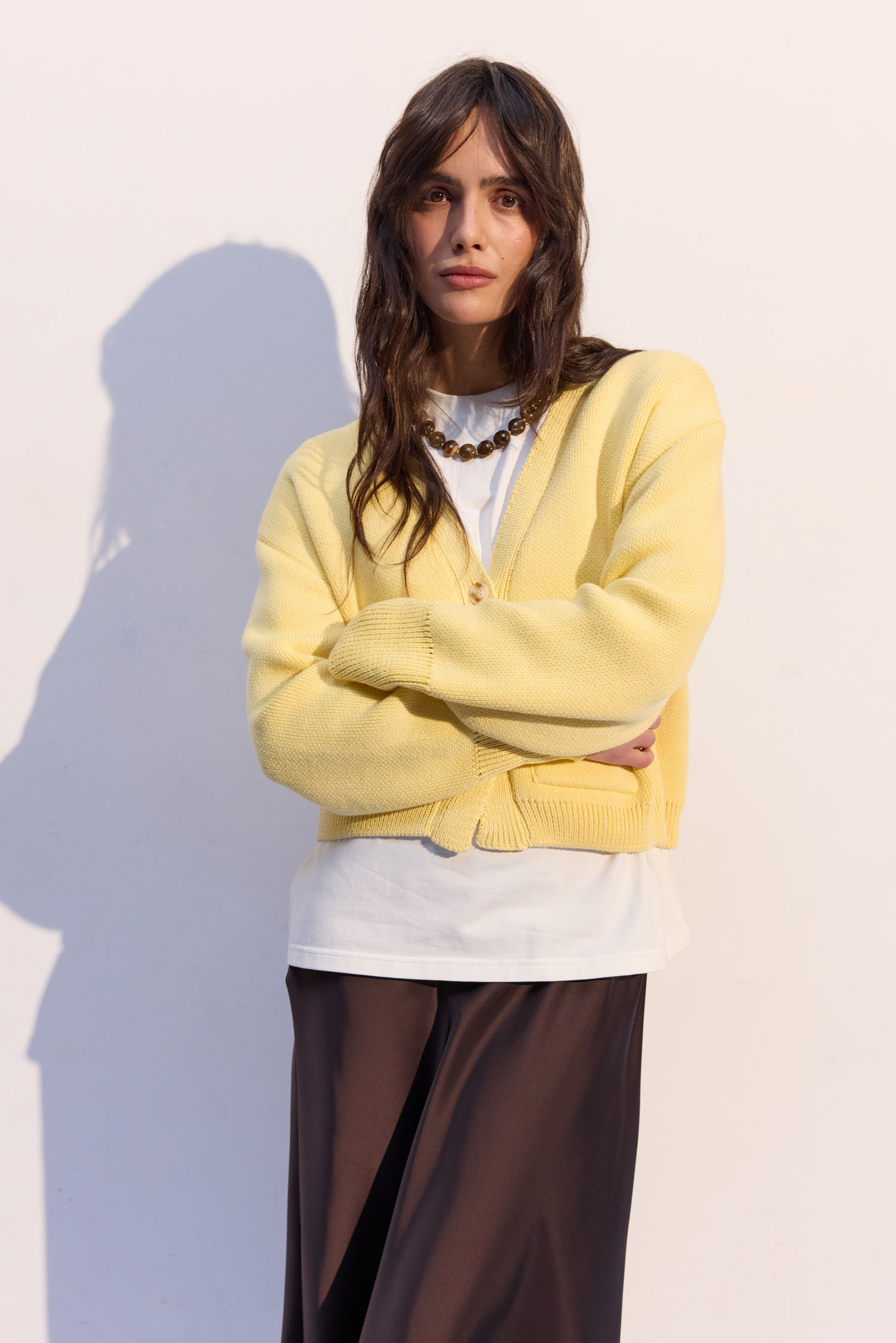 Женский трикотажный лимонный кардиган. Кардиган на трех больших пуговицах, имеет два кармана. Плотный и теплый вязаный кардиган из хлопковой пряжи для стильных образов. Идеально сочетается с юбками, брюками, джинсами.