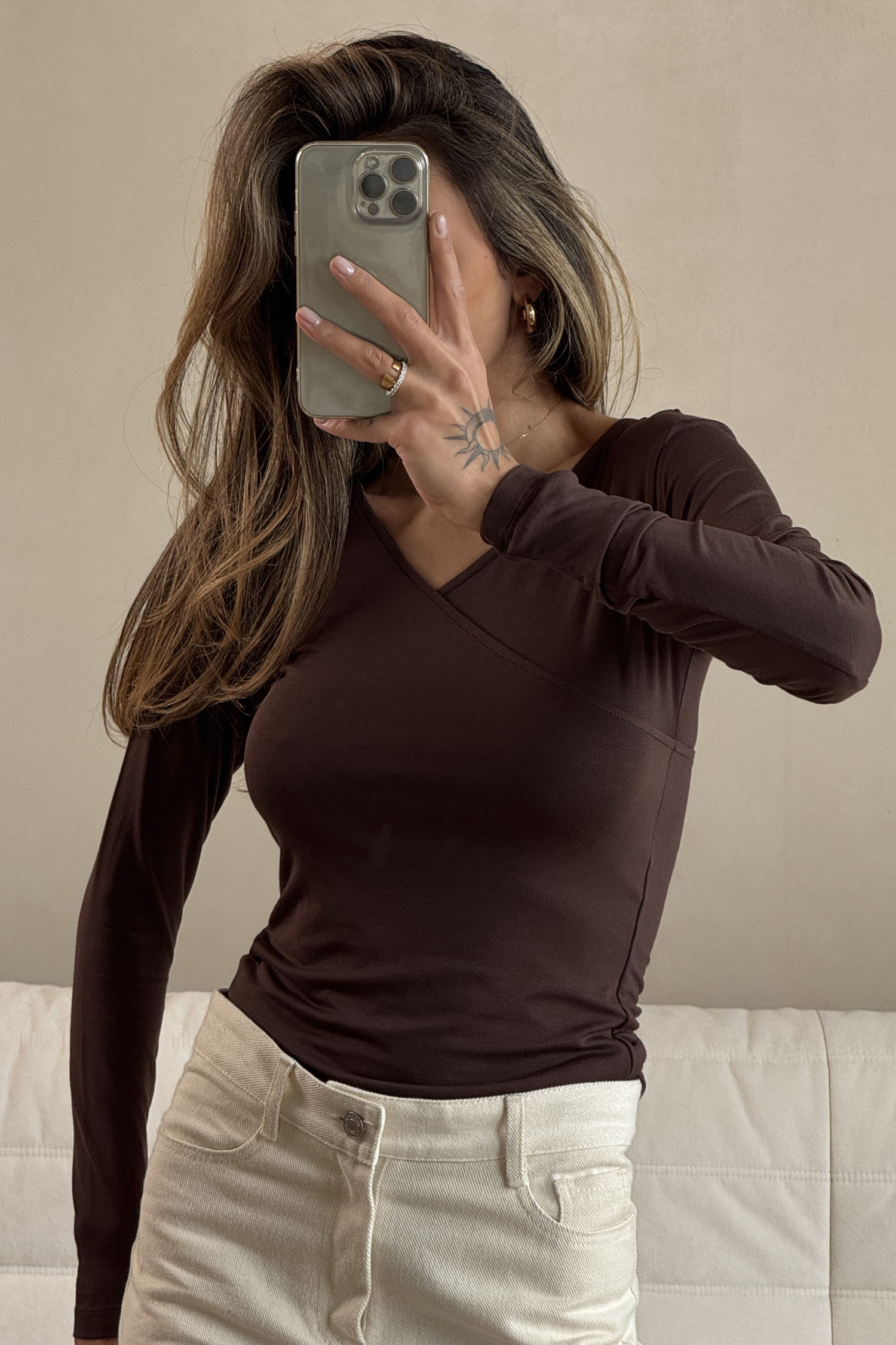 Женский лонгслив с v-вырезом шоколадный