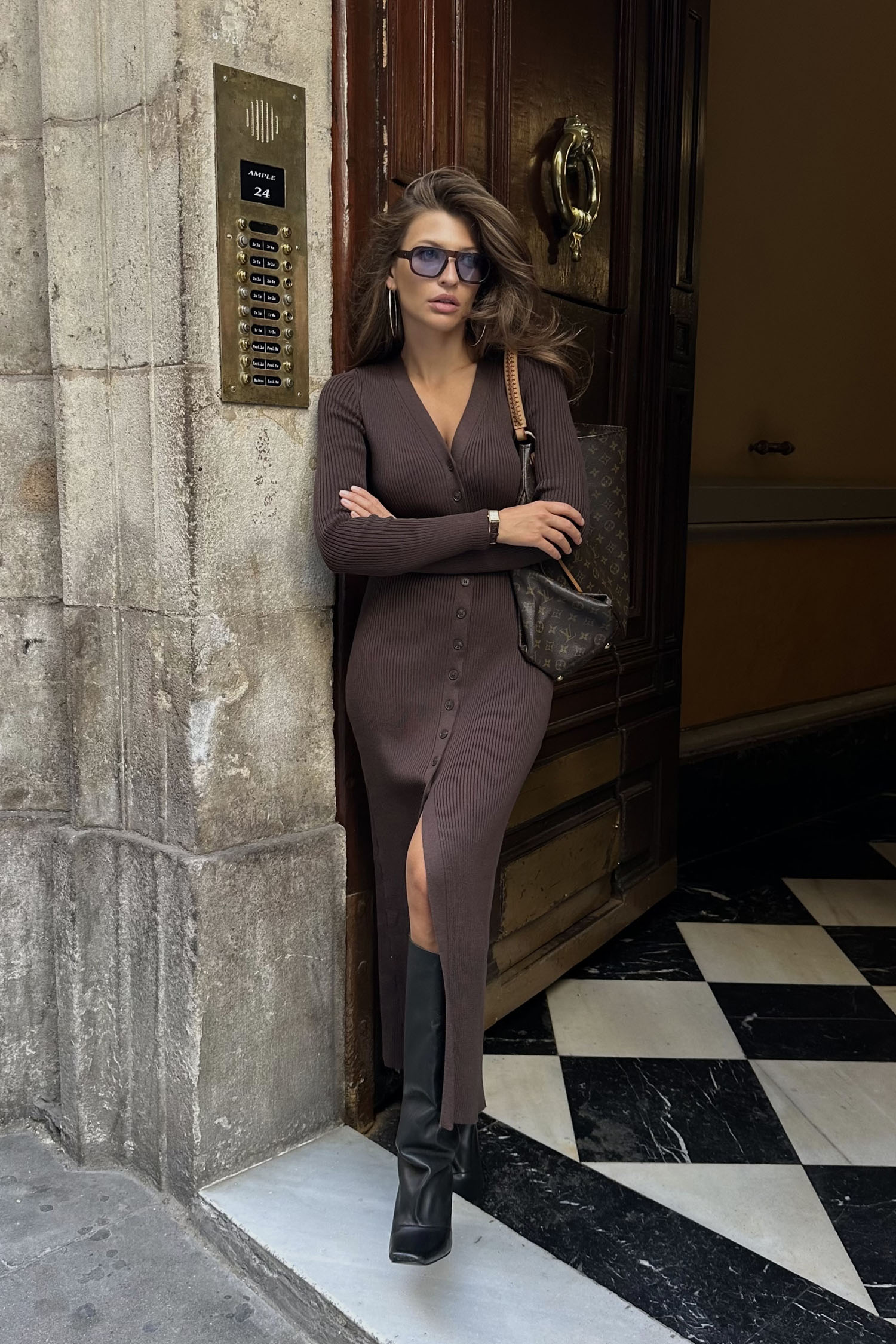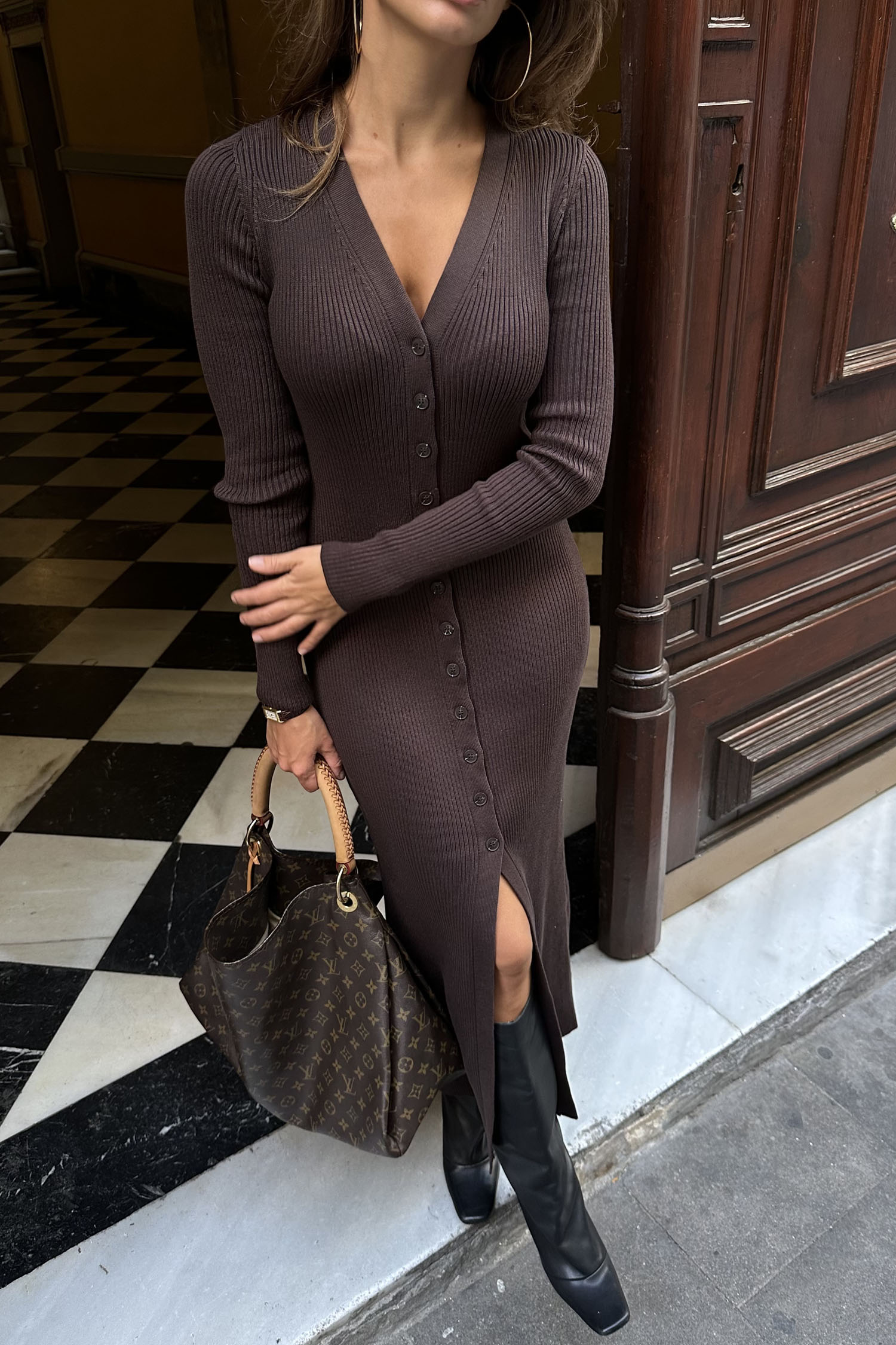 Женское трикотажное платье макси на пуговицах шоколадное