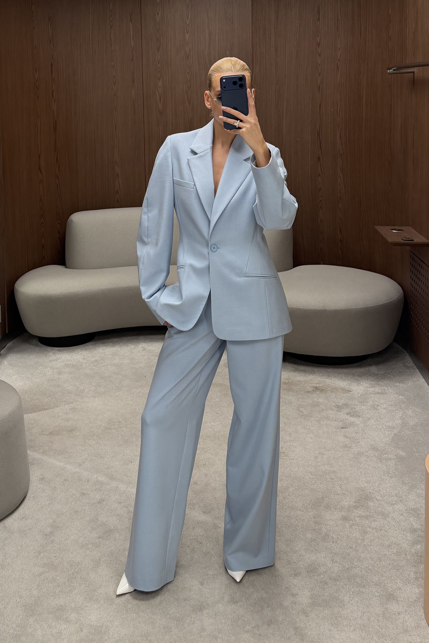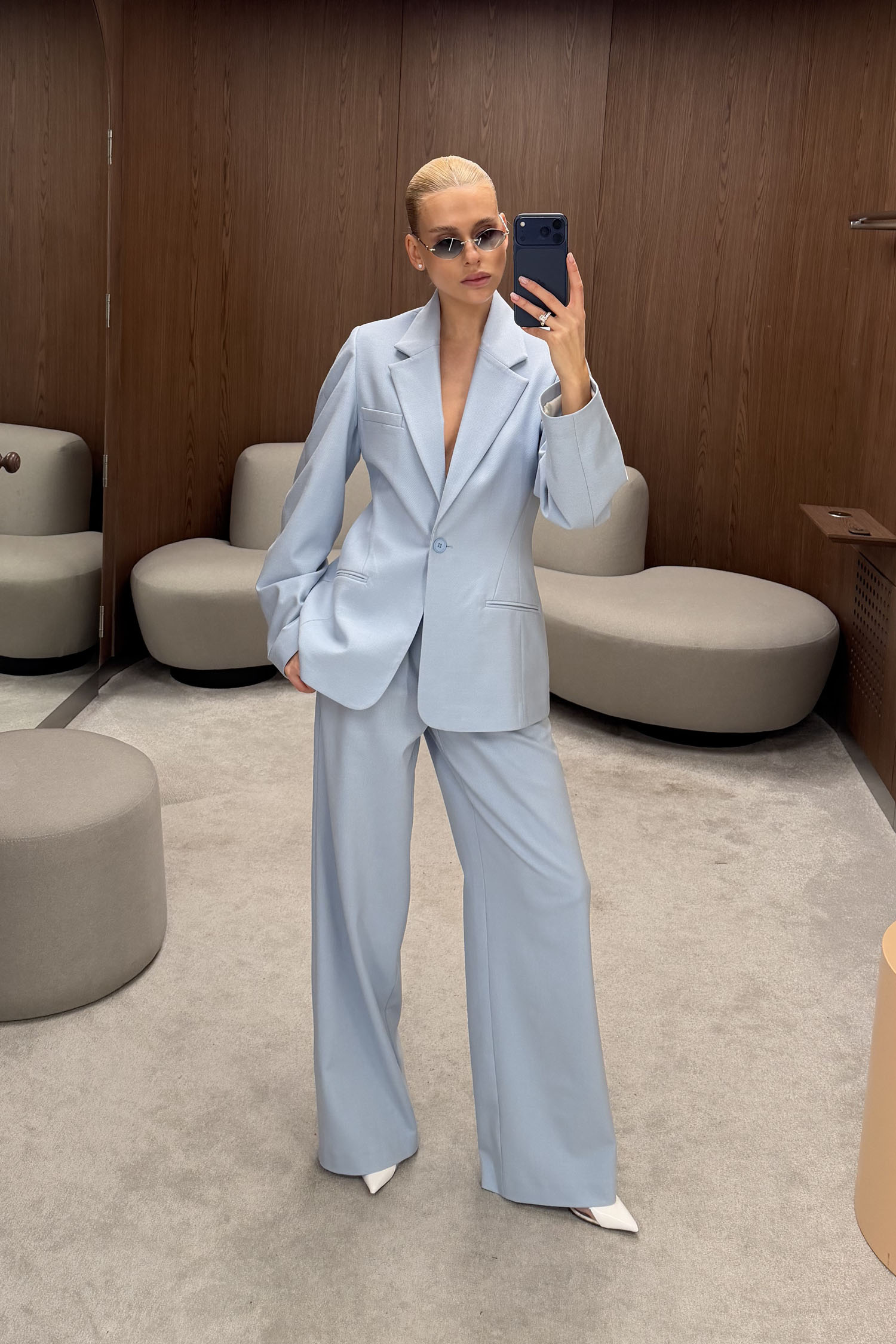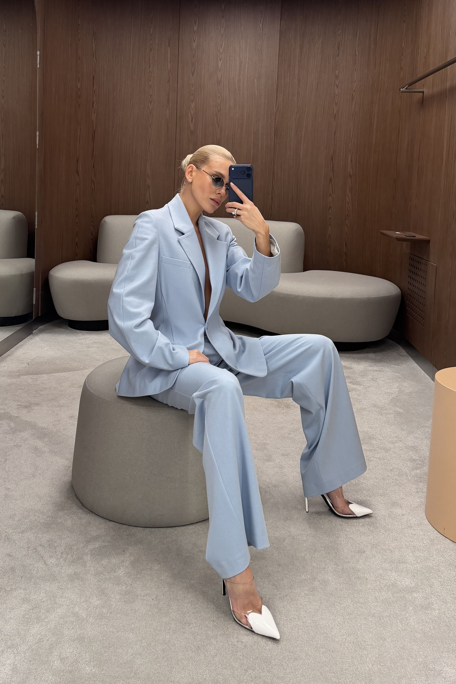 Жіночі брюки прямого крою у ніжно-блакитному кольорі. Брюки на високій посадці з цупкої костюмної тканини, добре тримають форму. Модель із подвійними защипами, має функціональні бічні кишені. Радимо поєднувати блакитні брюки із приталеним жакетом в тон для створення вишуканого образу.