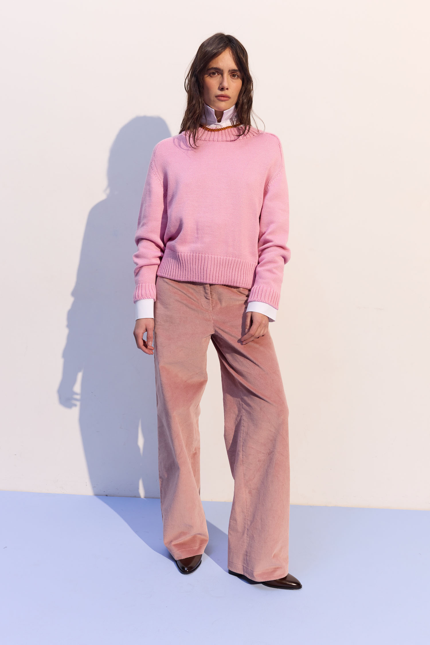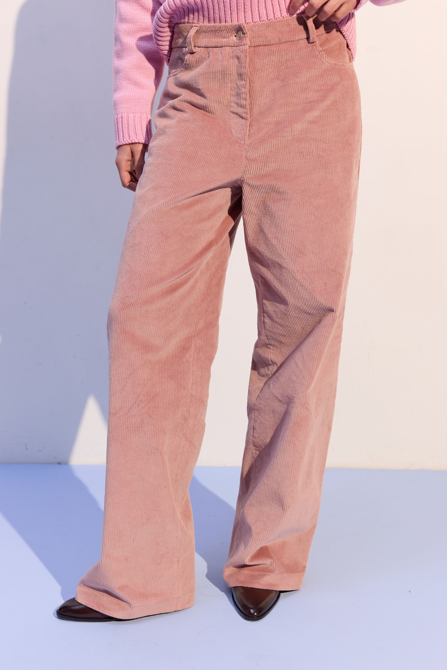 Жіночі брюки ніжно-рожевого кольору. Брюки вільного крою на високій посадці. Мають функціональні бічні та задні кишені. Лаконічна і водночас стильна модель з текстурного вельвету, який додасть глибини і кольору Вашим зимовим аутфітам.