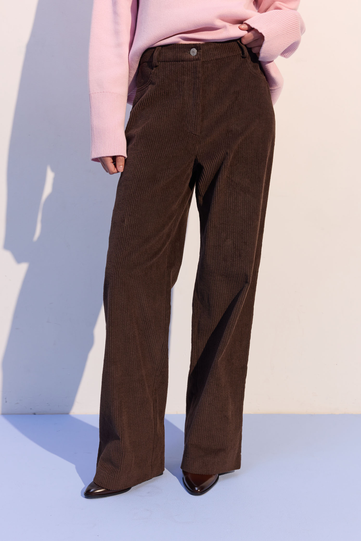 Жіночі брюки шоколадного кольору. Брюки вільного крою на високій посадці. Мають функціональні бічні та задні кишені. Лаконічна і водночас стильна модель з текстурного вельвету, який додасть глибини Вашим зимовим аутфітам.