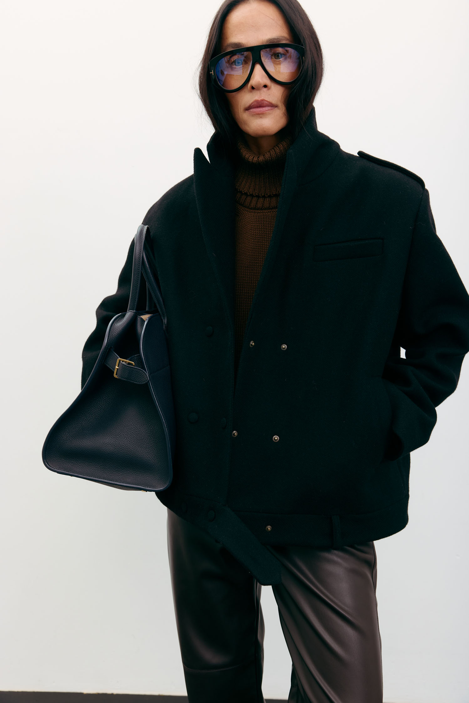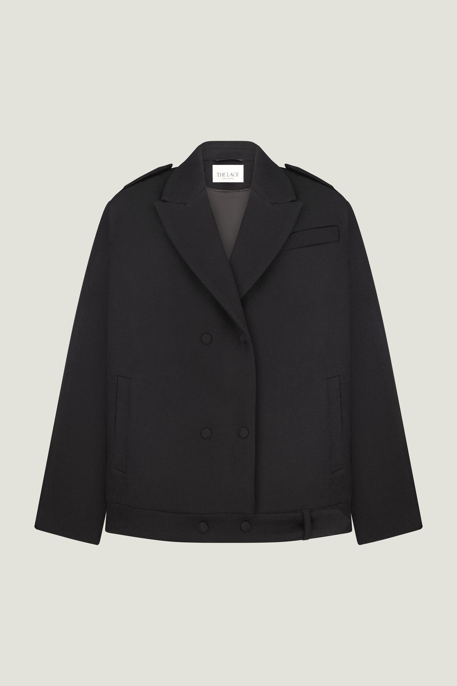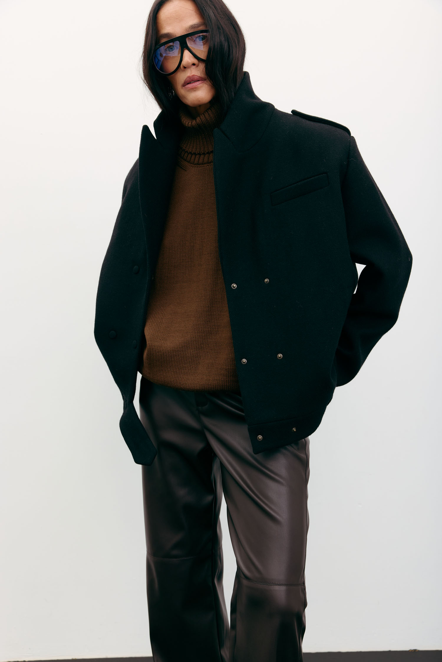 Жіноче вовняне пальто-жакет чорного кольору. Пальто виконане з цупкої вовняної тканини. Структурована модель із функціональними бічними кишенями, застібається на кнопки. Стильне, тепле і затишне пальто для безлічі образів осінньо-зимового сезону.