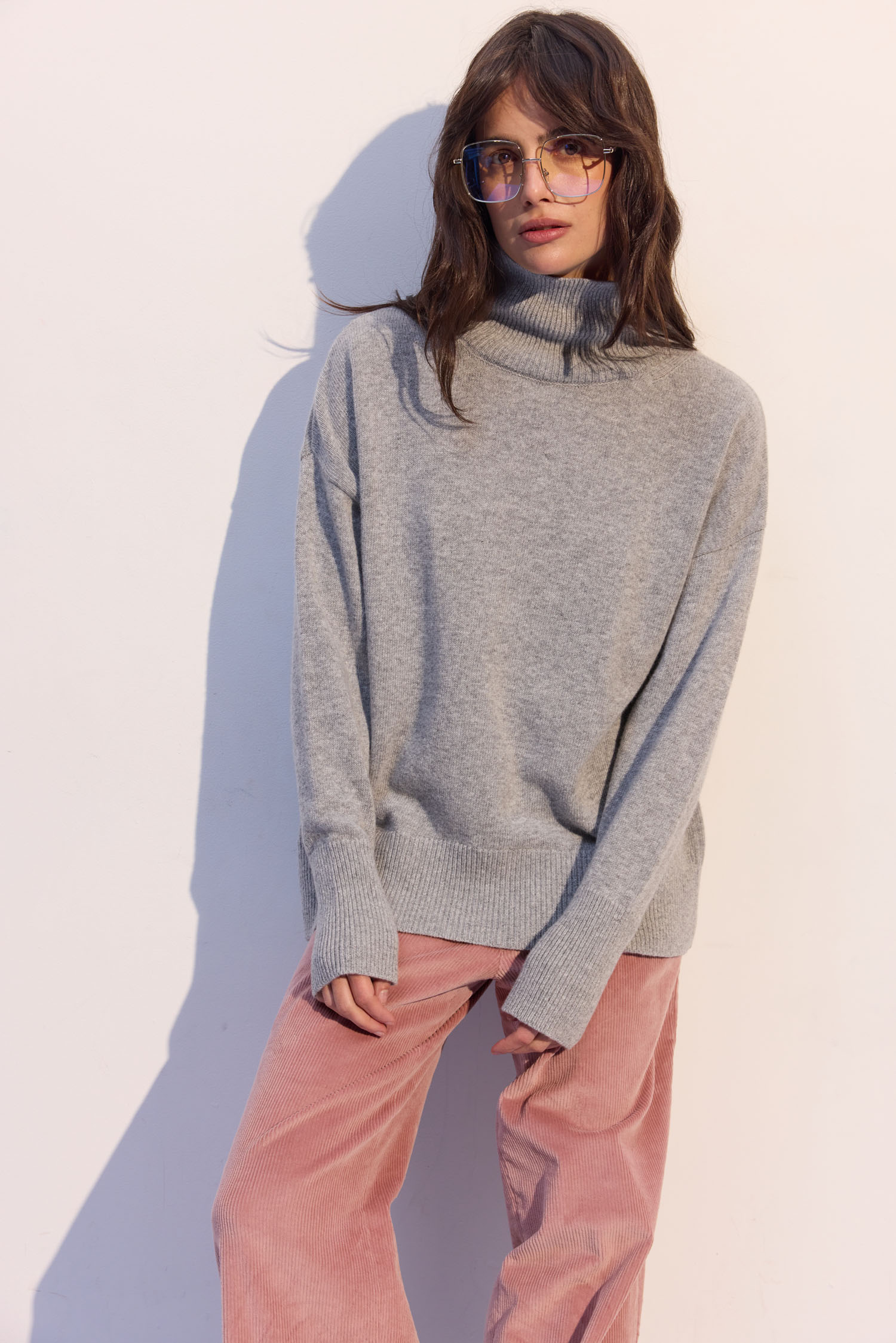 Високий комір щільно облягає шию, а вільний крій робить силует розслабленим і сучасним. Светр легко поєднується з джинсами, спідницями чи класичними брюками – виглядає однаково впевнено в будь-якому варіанті.