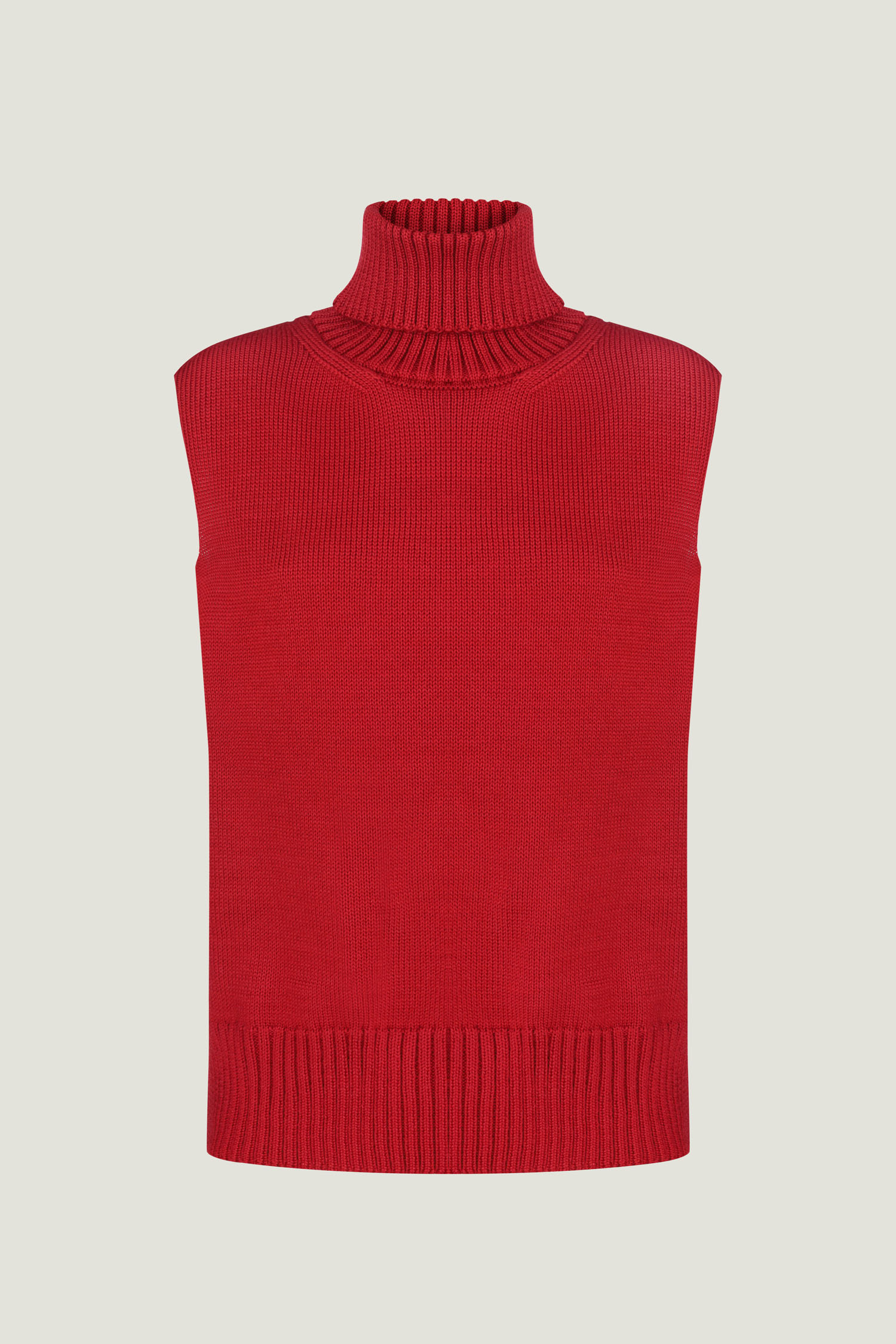 Жіночий жилет червоного кольору з напіввовняної пряжі. Має високу об’ємну горловину та лаконічний силует. Теплий і затишний жилет, що легко поєднується із базовими елементами гардероба, підходить для створення багатошарових образів восени.